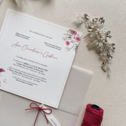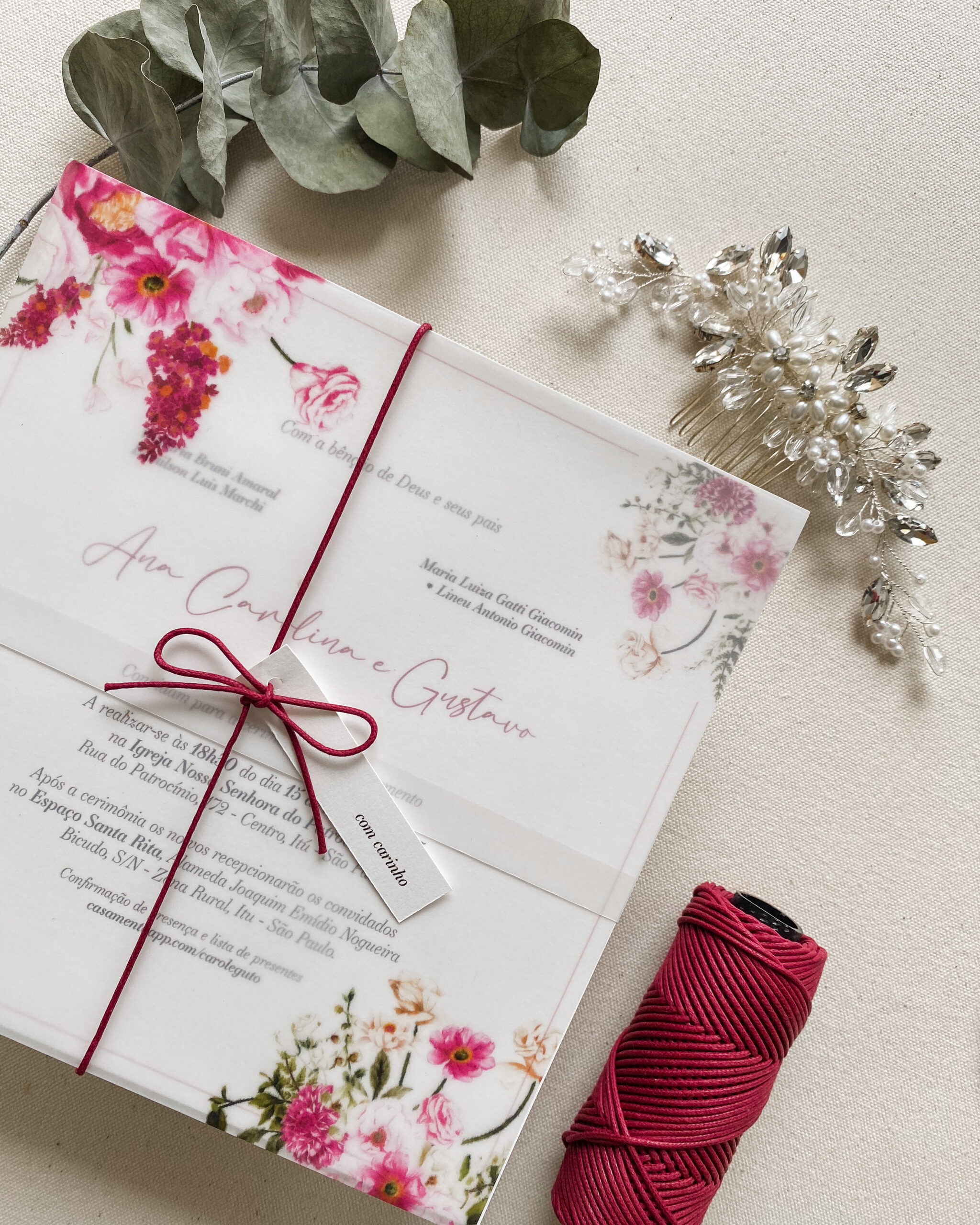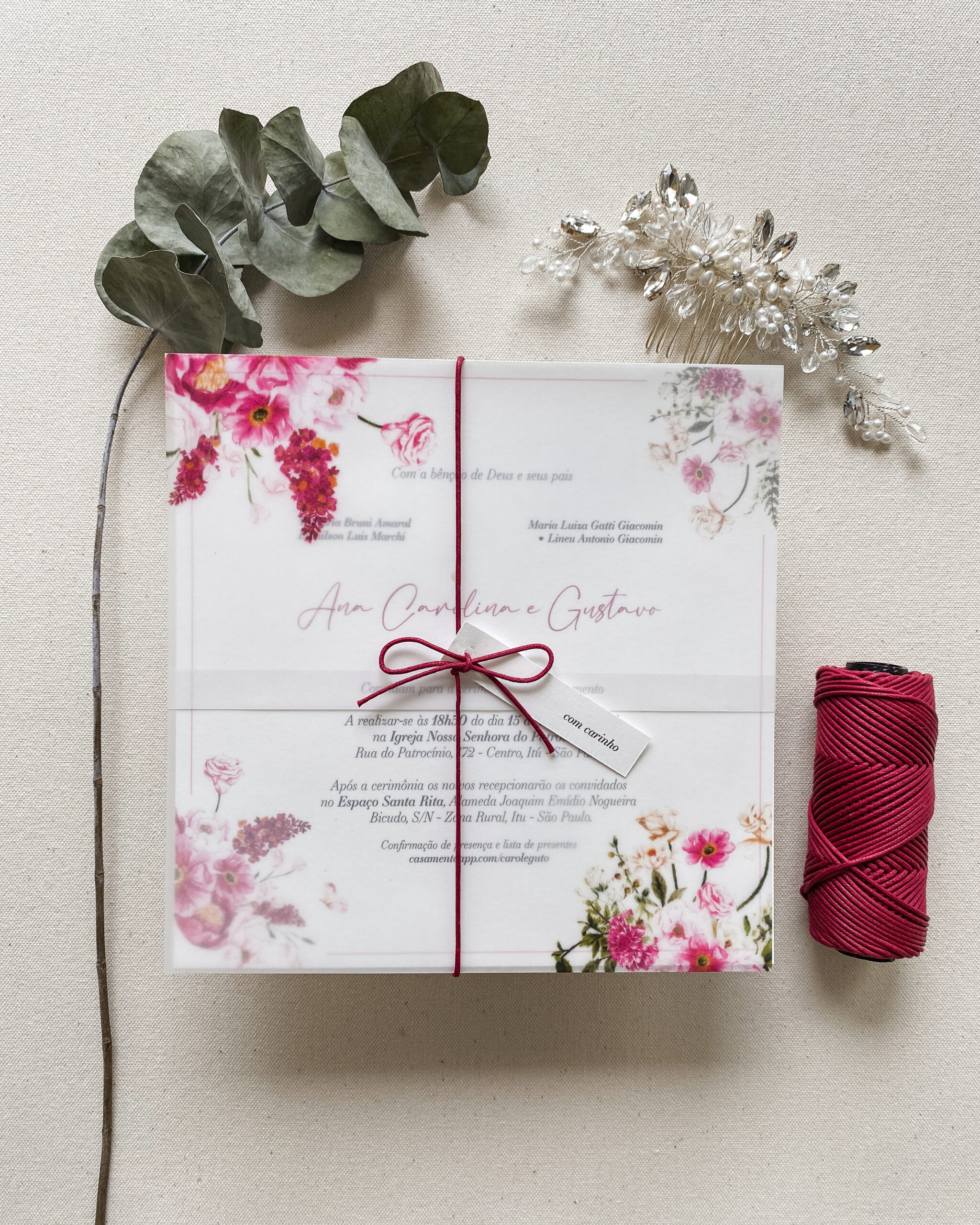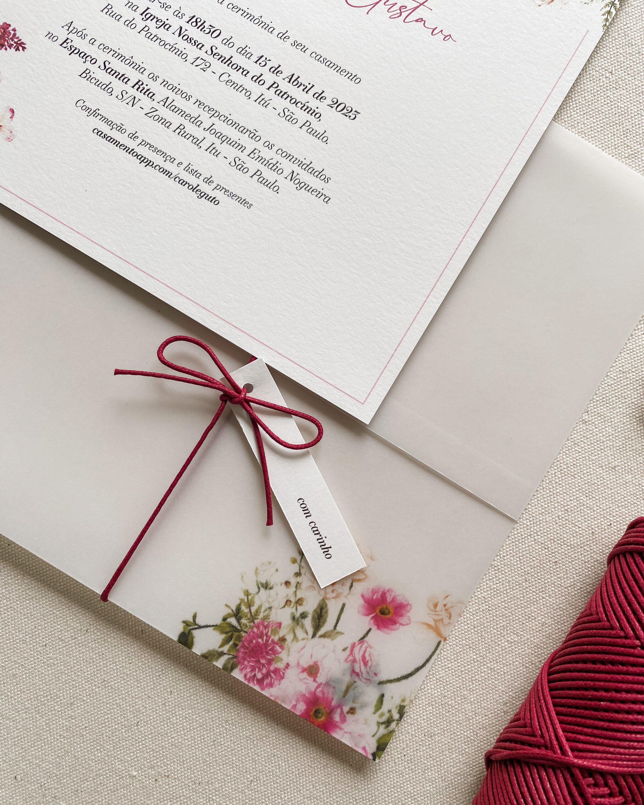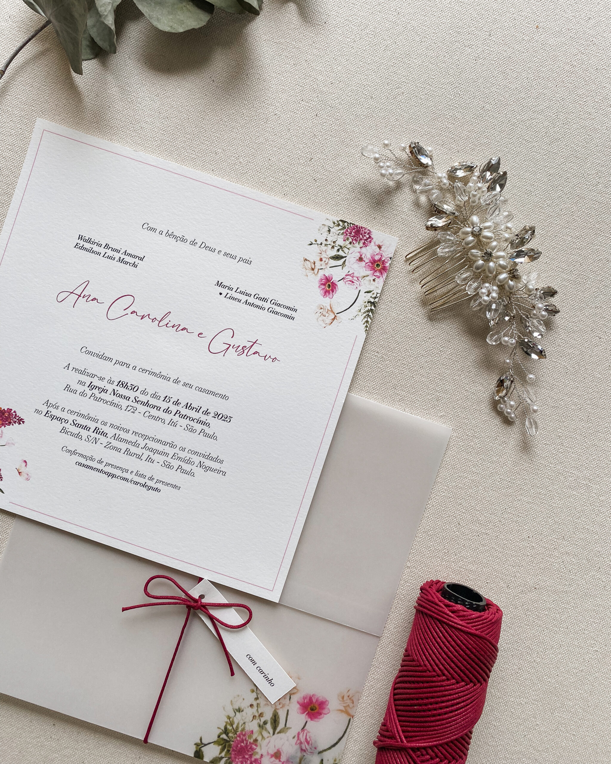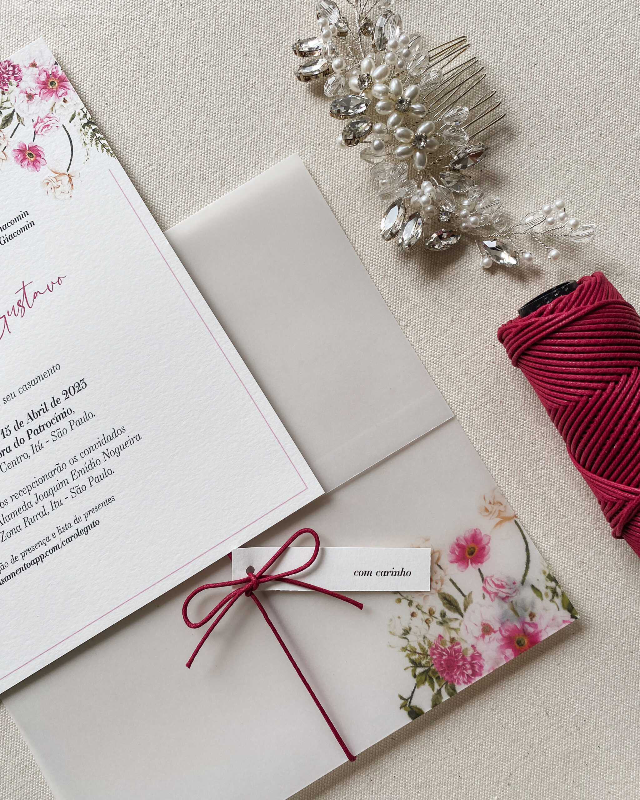 Menus, tags, numeração de mesa, lágrimas de alegria, manual de padrinhos e outros itens podem seguir a mesma identidade deste convite. Clique aqui