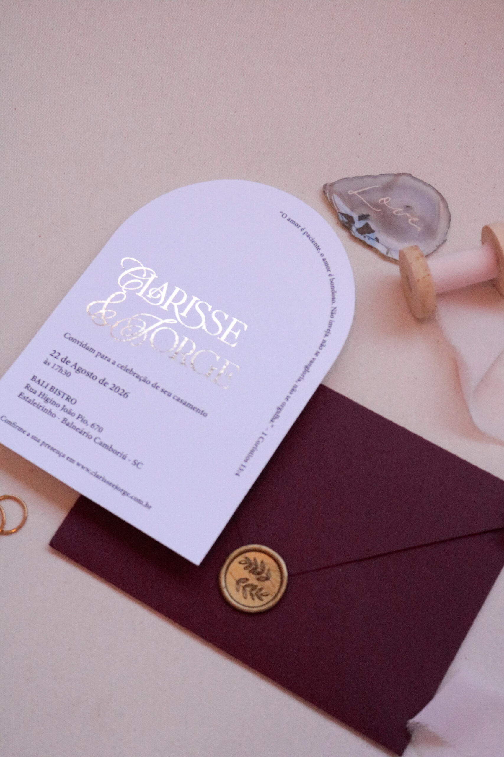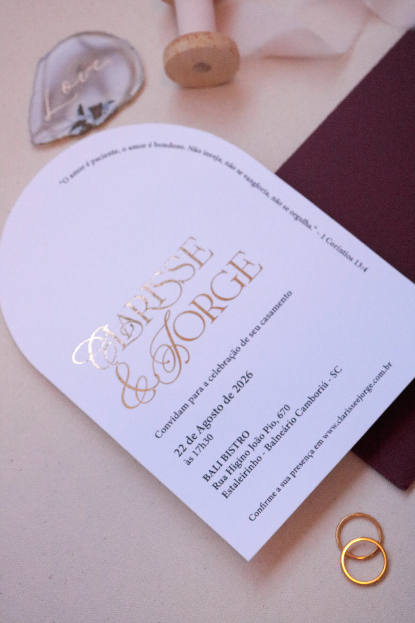 Menus, tags, numeração de mesa, lágrimas de alegria, manual de padrinhos e outros itens podem seguir a mesma identidade deste convite. Clique aqui